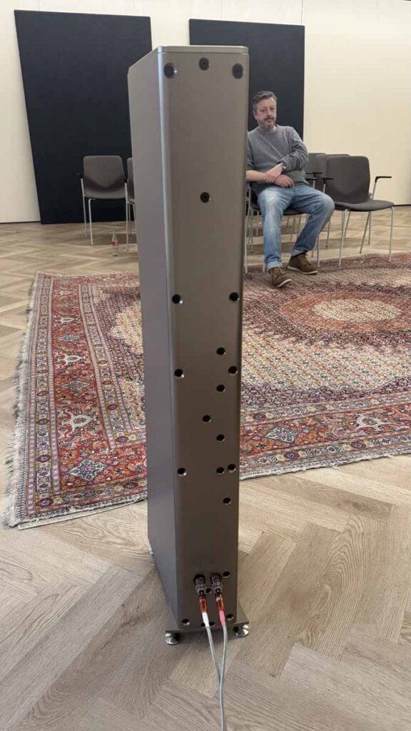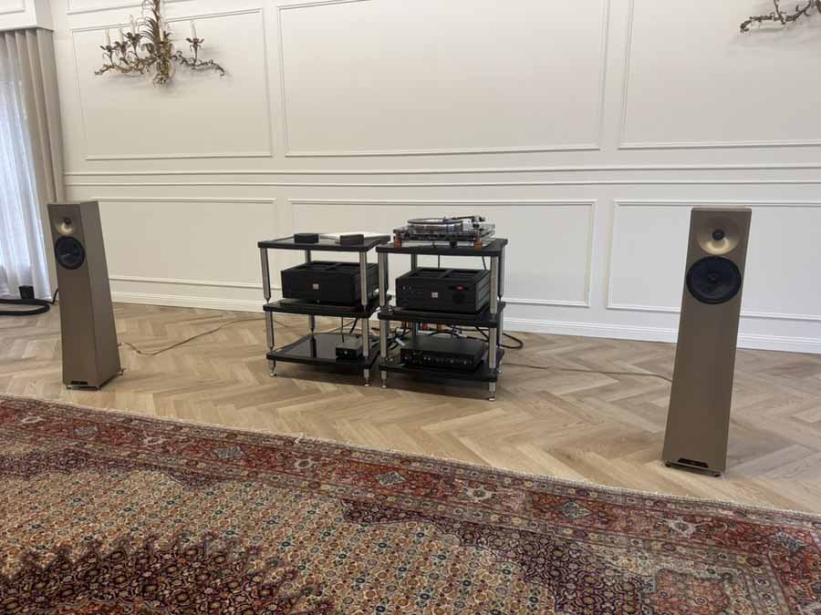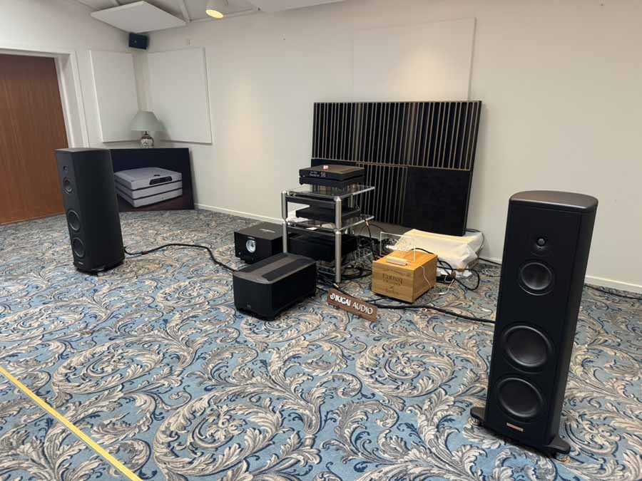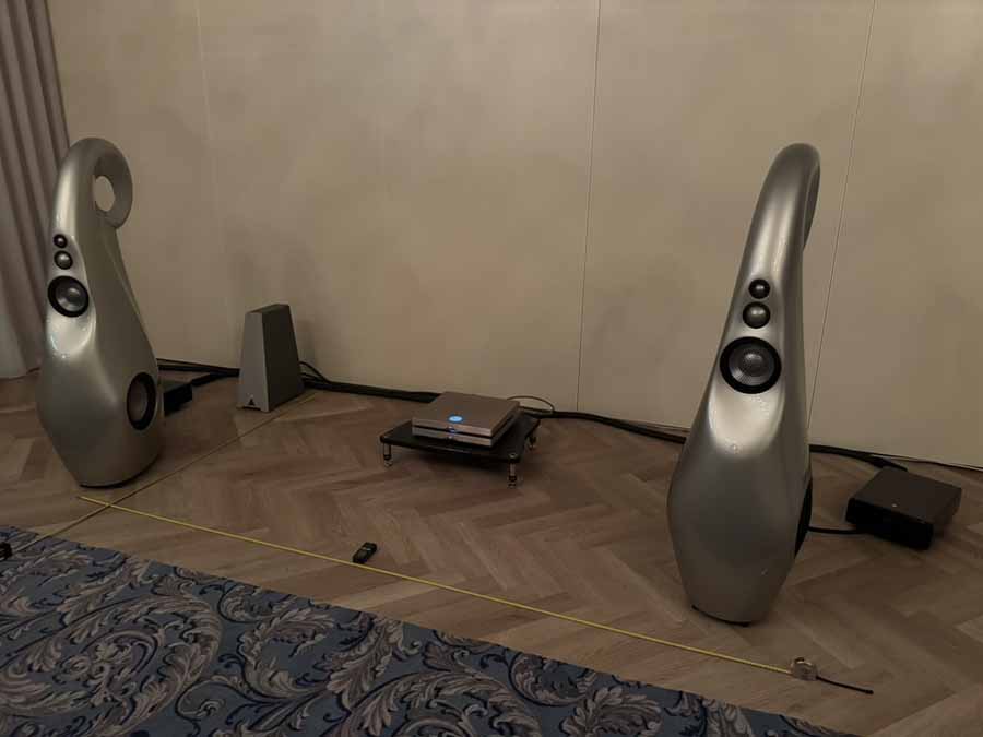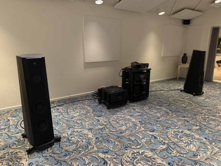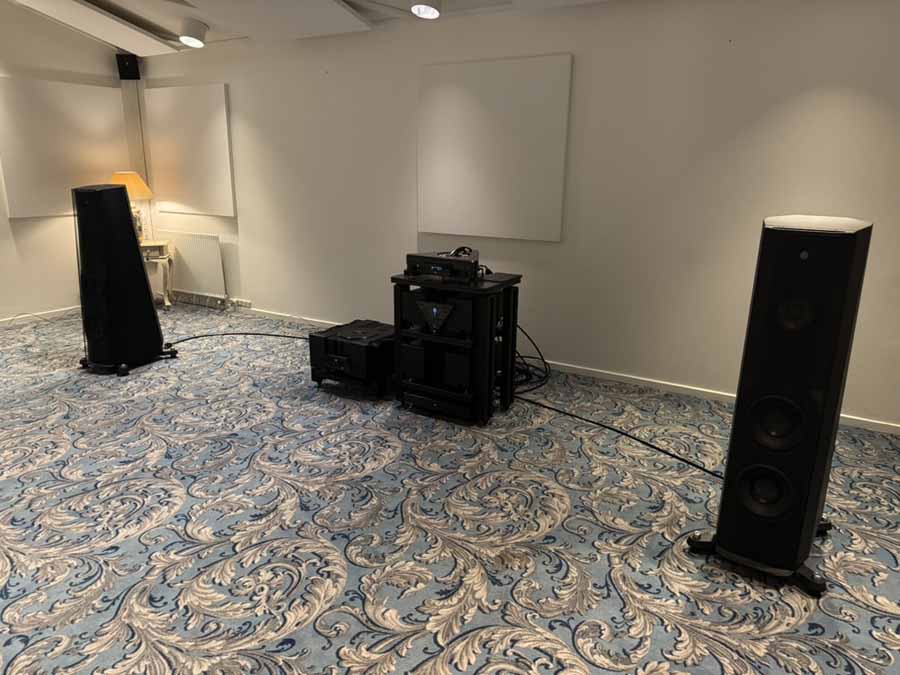 On Friday evening, while the various teams were working hard to optimise the upstairs systems for the challenging room acoustics, two of Morten’s long-time customers, who had kindly offered to lend a hand for the weekend, were tasked with unboxing and connecting the gear in this room. It’s quite reassuring for those of us who aren’t dealers setting up systems all the time, because the chaps got a really great sound going in the room just via playing around extensively with the speaker placement. There was no DSP running here, no acoustic panels anywhere, just the all-in-one and the S2s.
