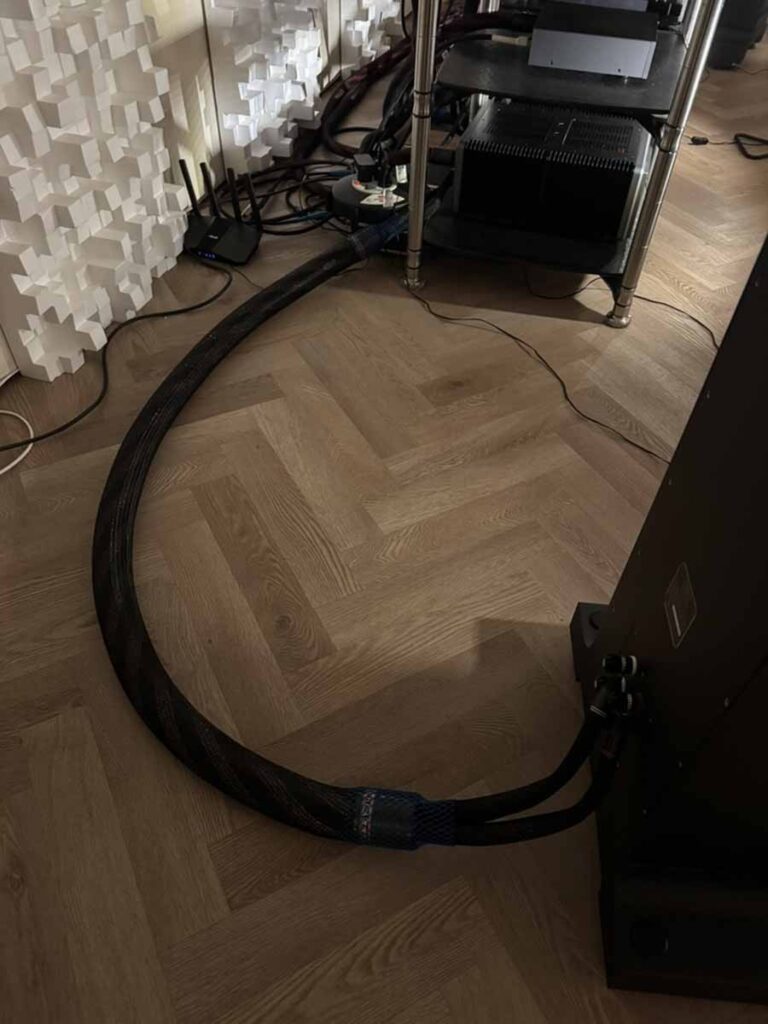Everything was connected together with Stealth Audio cables. Despite the name, there’s no mistaking the Stealth Audio cabling; it was by some margin the thickest at the show, and the cables feature alternating black and coloured stripes that spiral down the length. This was also an interesting setup in terms of cost balance; the cabling accounted for approximately 50% of the value of the boxes in the signal chain, which is definitely higher than most people would go.